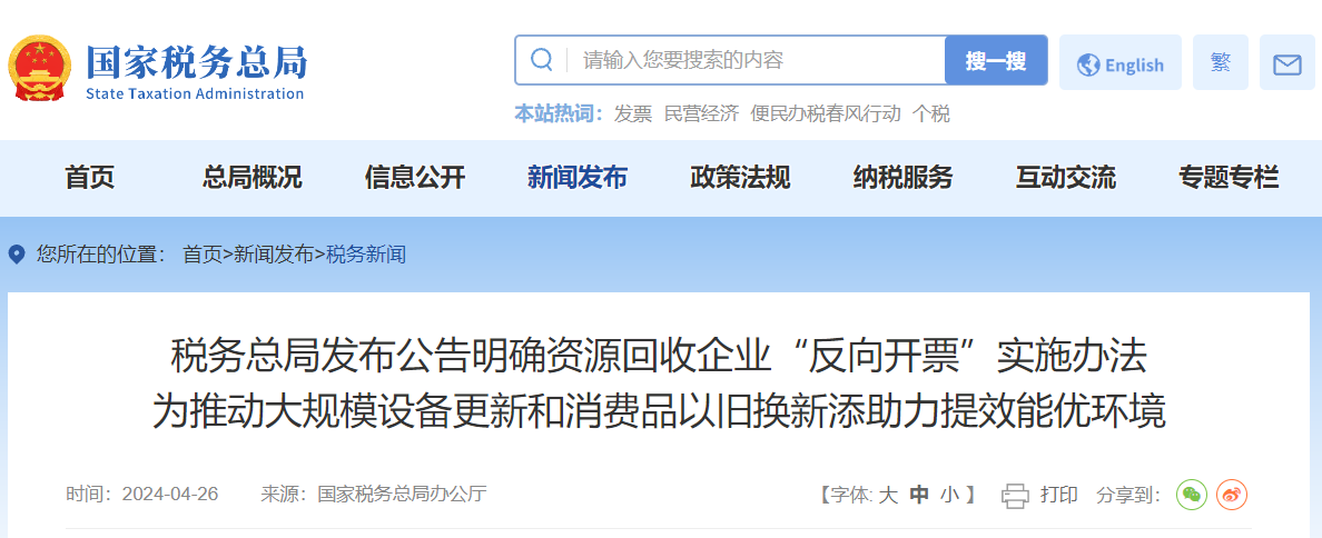 稅務(wù)總局發(fā)布公告明確資源回收企業(yè)“反向開票”實(shí)施辦法