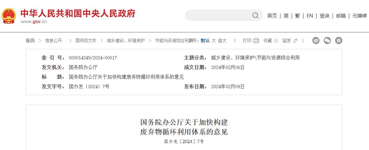 *********辦公廳關于加快構建廢棄物循環(huán)利用體系的意見