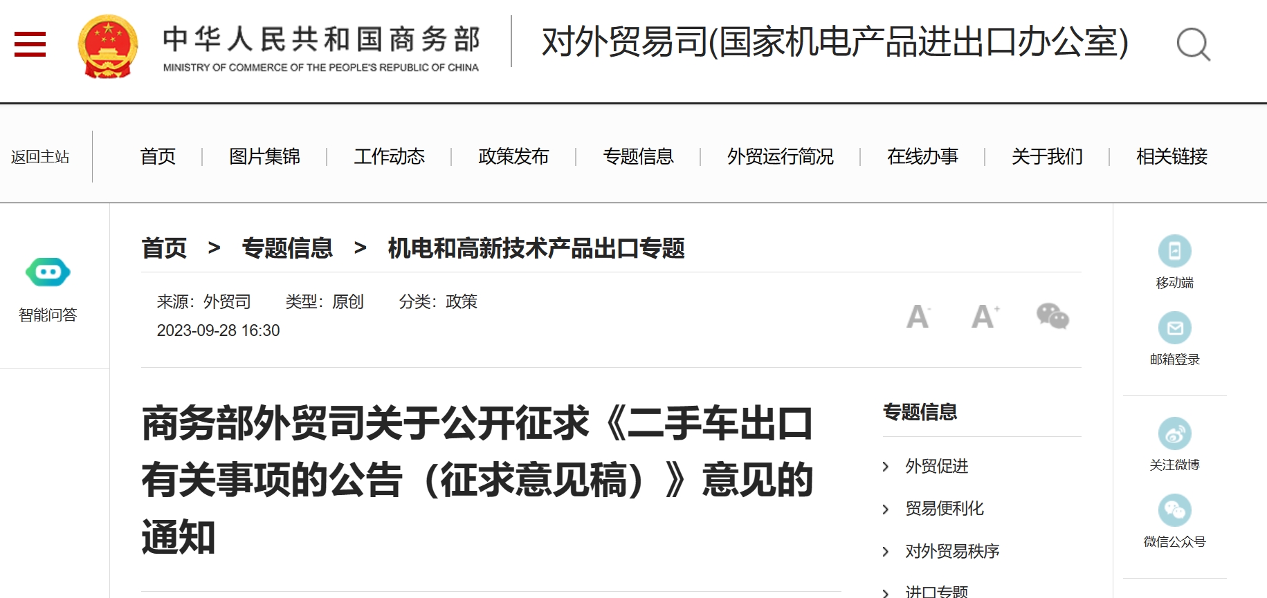 商務(wù)部外貿(mào)司關(guān)于公開(kāi)征求《二手車出口有關(guān)事項(xiàng)的公告(征求意見(jiàn)稿)》意見(jiàn)的通知