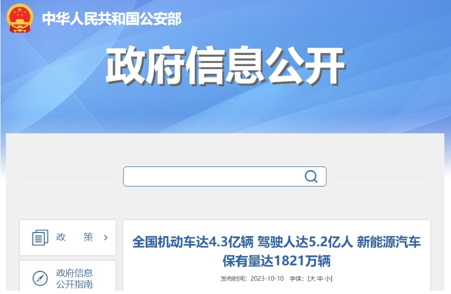 公安部:截至2023年9月底全國(guó)機(jī)動(dòng)車達(dá)4.3億輛新能源汽車保有量達(dá)1821萬(wàn)輛
