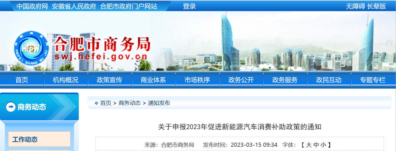 安徽省合肥市商務(wù)局關(guān)于申報(bào)2023年促進(jìn)新能源汽車消費(fèi)補(bǔ)助政策的通知為貫徹落實(shí)2023年《合肥市人民政府辦公室關(guān)于印發(fā)合肥市“提信心拼經(jīng)濟(jì)”若干政策措施的通知》...