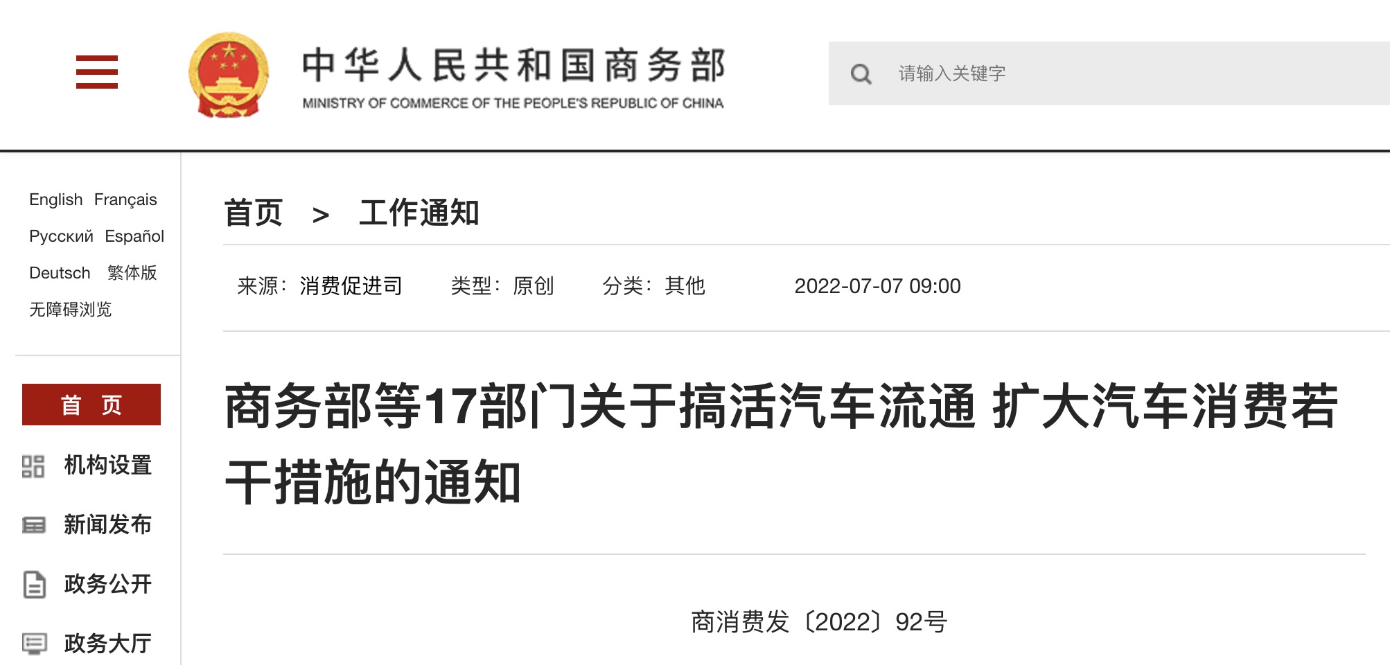 商消費發(fā)〔2022〕92號各省、自治區(qū)、直轄市人民政府,新疆生產(chǎn)建設兵團:汽車業(yè)是國民經(jīng)濟的戰(zhàn)略性、支柱性產(chǎn)業(yè)。為進一步搞活汽車流通,擴大汽車消費,助力穩(wěn)定經(jīng)濟...