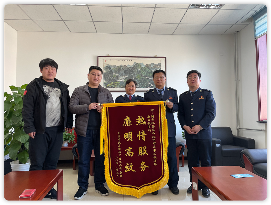 2022年3月7日,北京市汽車(chē)解體廠將一面印有“熱情服務(wù),廉明高效”的錦旗送到昌平區(qū)稅務(wù)局南口稅務(wù)所。對(duì)南口稅務(wù)所一直以來(lái)對(duì)我企業(yè)熱情周到、廉明高效的服務(wù),我企...
