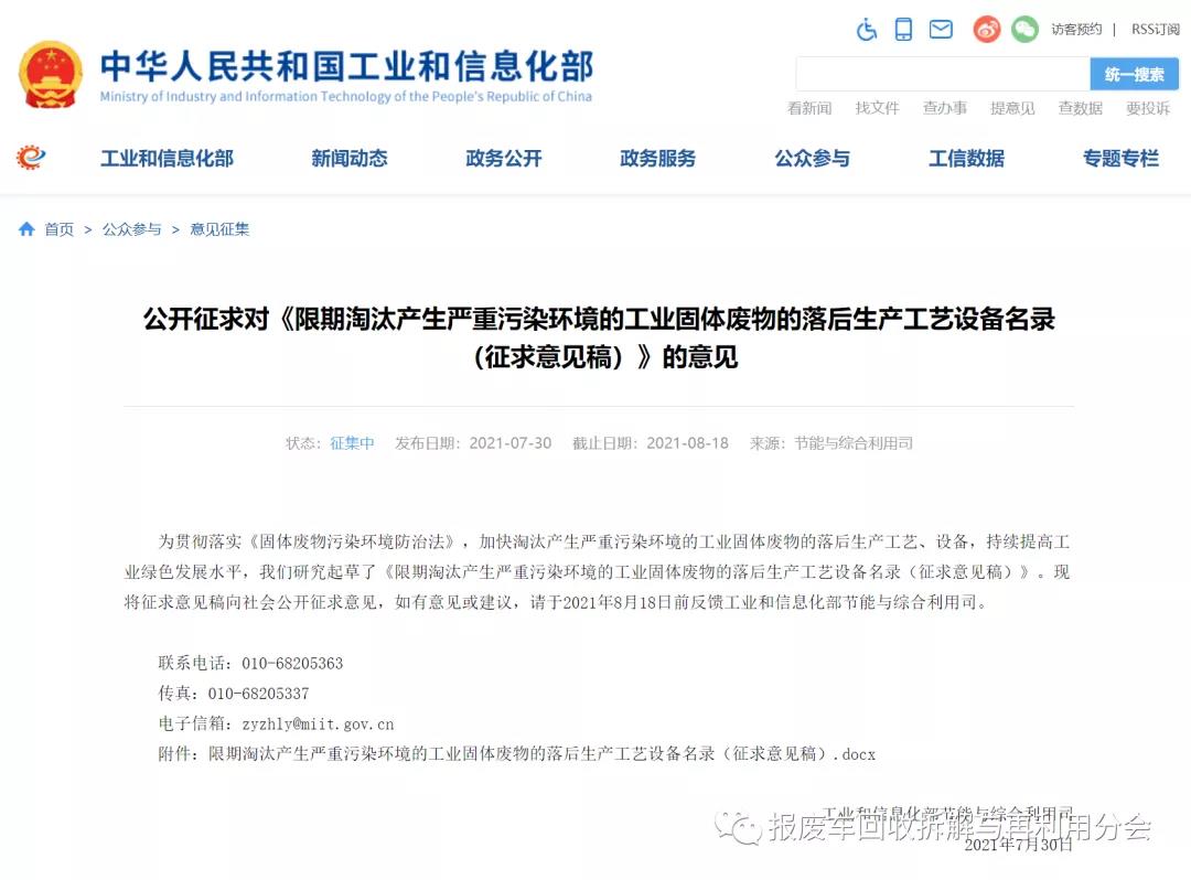 為貫徹落實(shí)《固體廢物污染環(huán)境防治法》,加快淘汰產(chǎn)生嚴(yán)重污染環(huán)境的工業(yè)固體廢物的落后生產(chǎn)工藝、設(shè)備,持續(xù)提高工業(yè)綠色發(fā)展水平,我們研究起草了《限期淘汰產(chǎn)生嚴(yán)重污染...