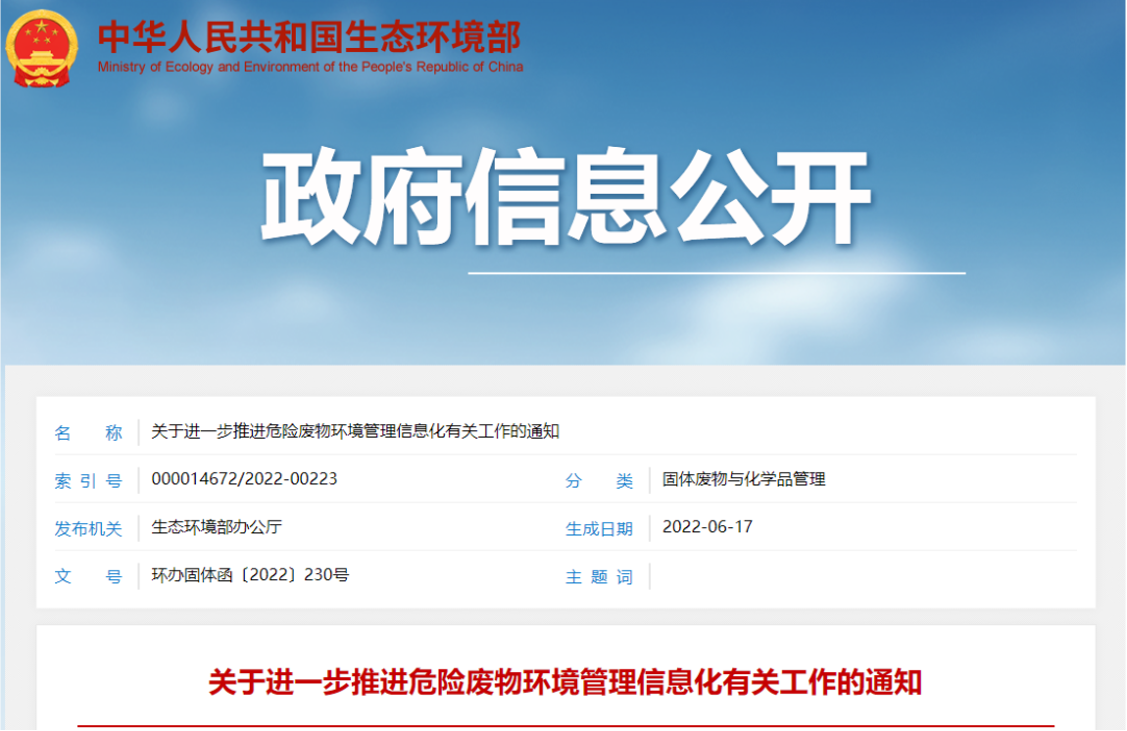 生態(tài)環(huán)境部關于進一步推進危險廢物環(huán)境管理信息化有關工作的通知各省、自治區(qū)、直轄市生態(tài)環(huán)境廳(局),新疆生產建設兵團生態(tài)環(huán)境局:為貫徹落實《中華人民共和國固體廢物...