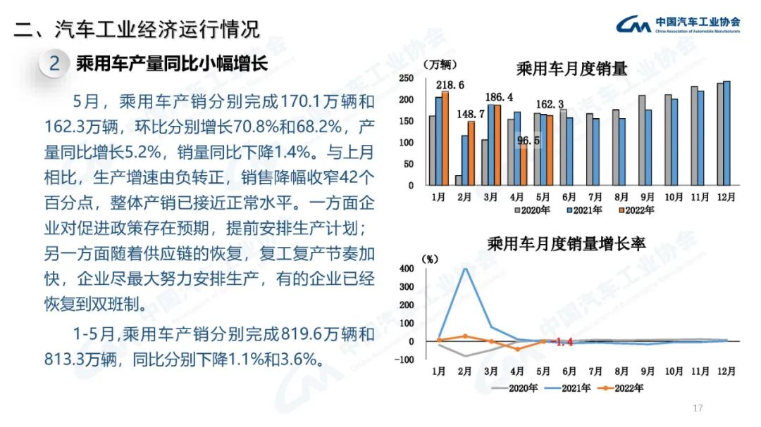 受利好因素影響,5月汽車產(chǎn)銷呈現(xiàn)明顯恢復(fù)性增長(zhǎng)。乘用車產(chǎn)量已高于同期水平,銷量略低于同期水平,恢復(fù)情況良好;商用車市場(chǎng)恢復(fù)程度明顯不足,產(chǎn)銷同比依然呈明顯下降。新能源汽車表現(xiàn)依然出色。本月出口表現(xiàn)也較為突出,出口量創(chuàng)年內(nèi)新高。