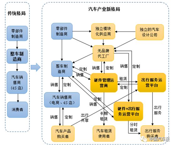 隨著汽車消費側(cè)出現(xiàn)消費者從買車到租車,從購買汽車產(chǎn)品轉(zhuǎn)向購買出行服務,傳統(tǒng)整車企業(yè)通過產(chǎn)品品牌對消費者的影響力減弱;隨著汽車電動化、數(shù)字化、網(wǎng)絡化和平臺化的發(fā)展趨向,傳統(tǒng)整車企業(yè)通過垂直分工體系對供應鏈的控制力逐步減弱;隨著具有典型互聯(lián)網(wǎng)模式、對消費者偏好和需求有充分了解的平臺公司崛起,以傳統(tǒng)整車企業(yè)為中心的產(chǎn)業(yè)流程正在改變,產(chǎn)業(yè)重心正在從汽車制造向出行服務轉(zhuǎn)移。汽車產(chǎn)業(yè)經(jīng)歷了上百年的發(fā)展,以傳統(tǒng)整車企業(yè)為中心、大規(guī)模生產(chǎn)和大規(guī)模銷售模式為主導的傳統(tǒng)汽車產(chǎn)業(yè)格局正在走向以滿足個性化消費和出行服務為中心的新產(chǎn)業(yè)格局。下圖為汽車傳統(tǒng)產(chǎn)業(yè)格局和新產(chǎn)業(yè)格局的對比。
